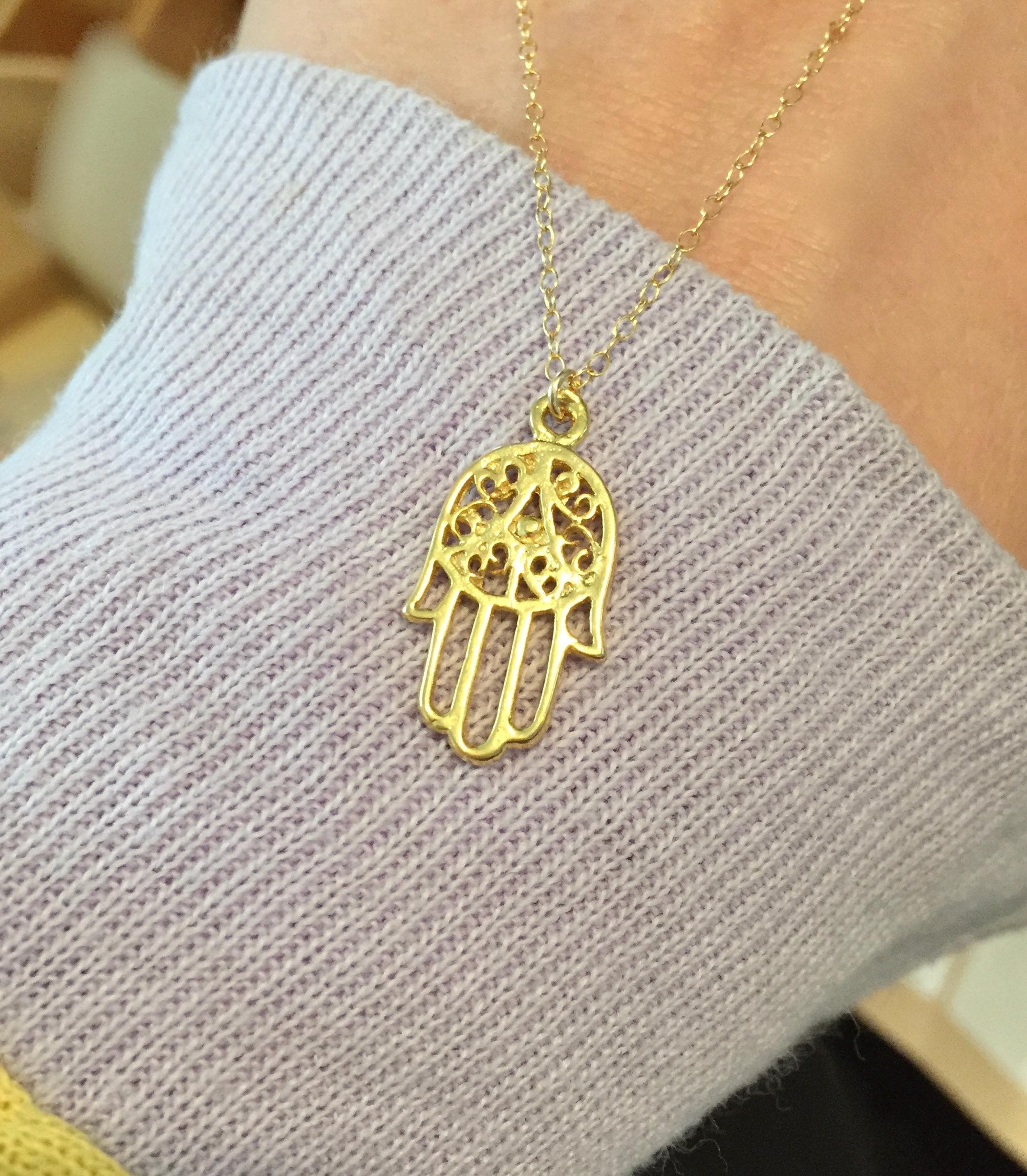 This beautiful shiny gold vermeil hamsa hangs from a 14k gold filled chain in the length of your choice. This hamsa measures 18mmx12mm and is also available in sterling silver.