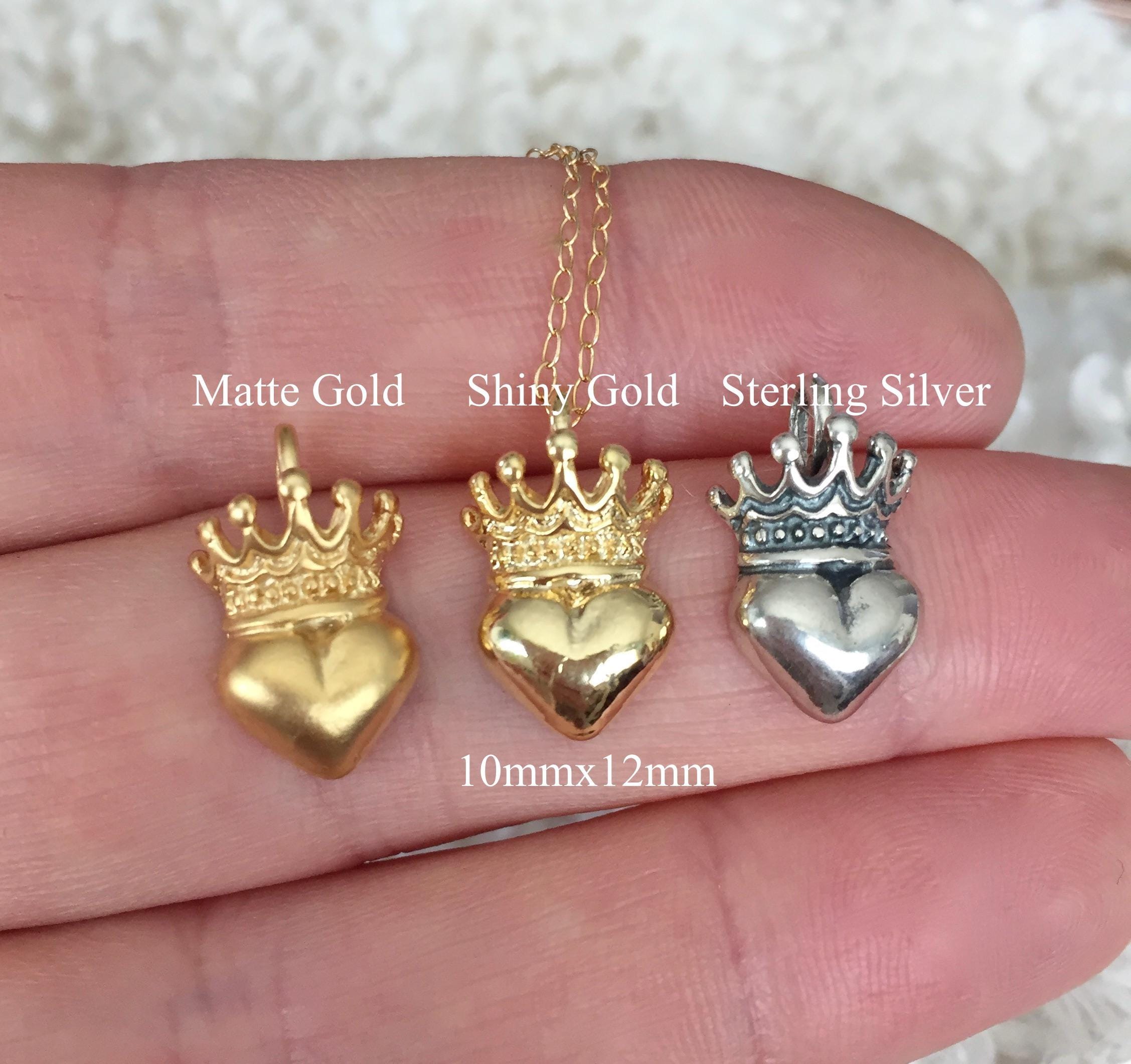This shiny 14k gold vermeil heart and crown hangs from a 14k gold filled chain in the length of your choice. This beauty is also available in sterling silver. The pendant measures 10mm x 12mm.