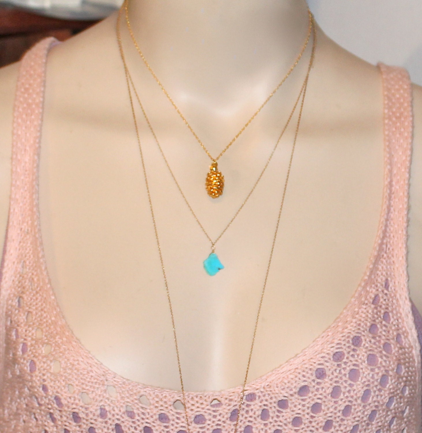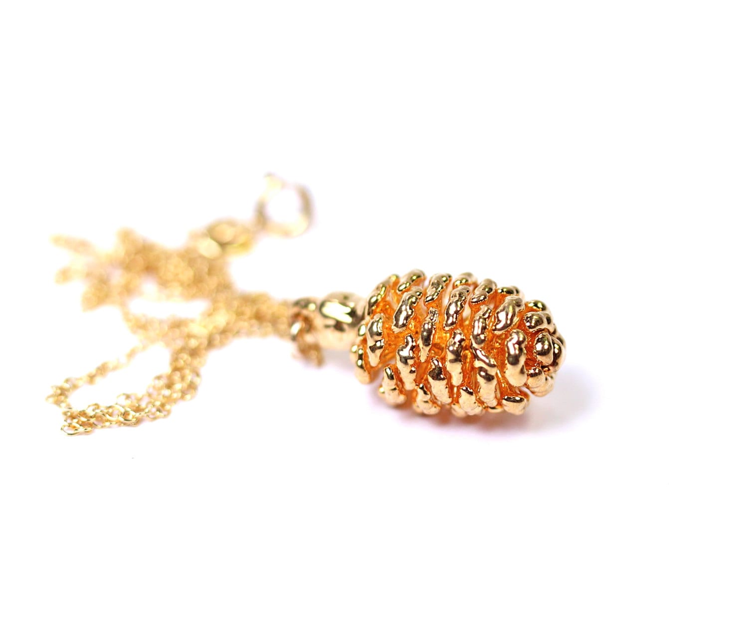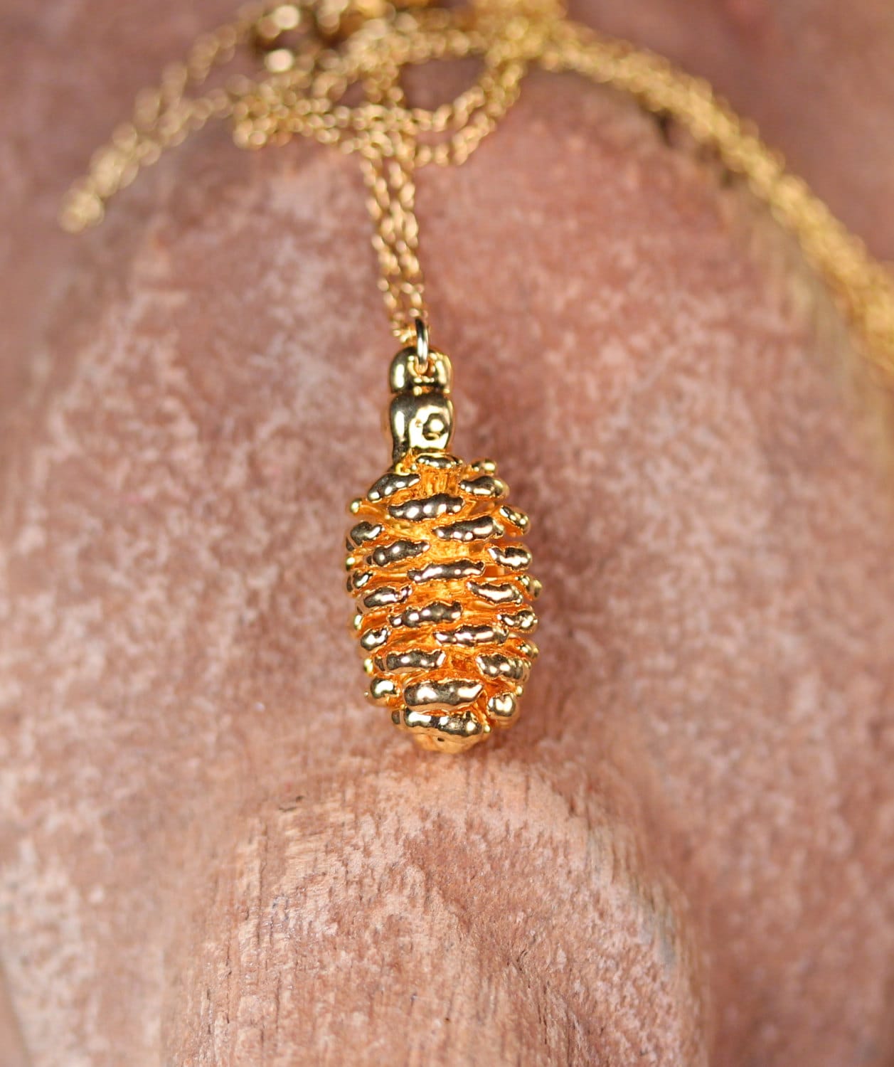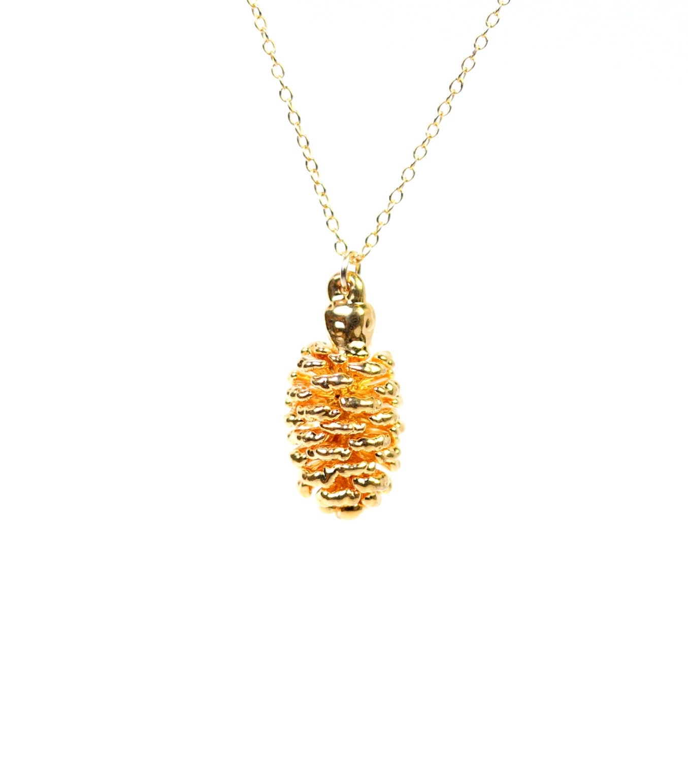 A 14k gold vermeil pinecone hangs peacefully from a 14k gold filled chain in the length of your choice! The pinecone measures 12mm x 10mm.